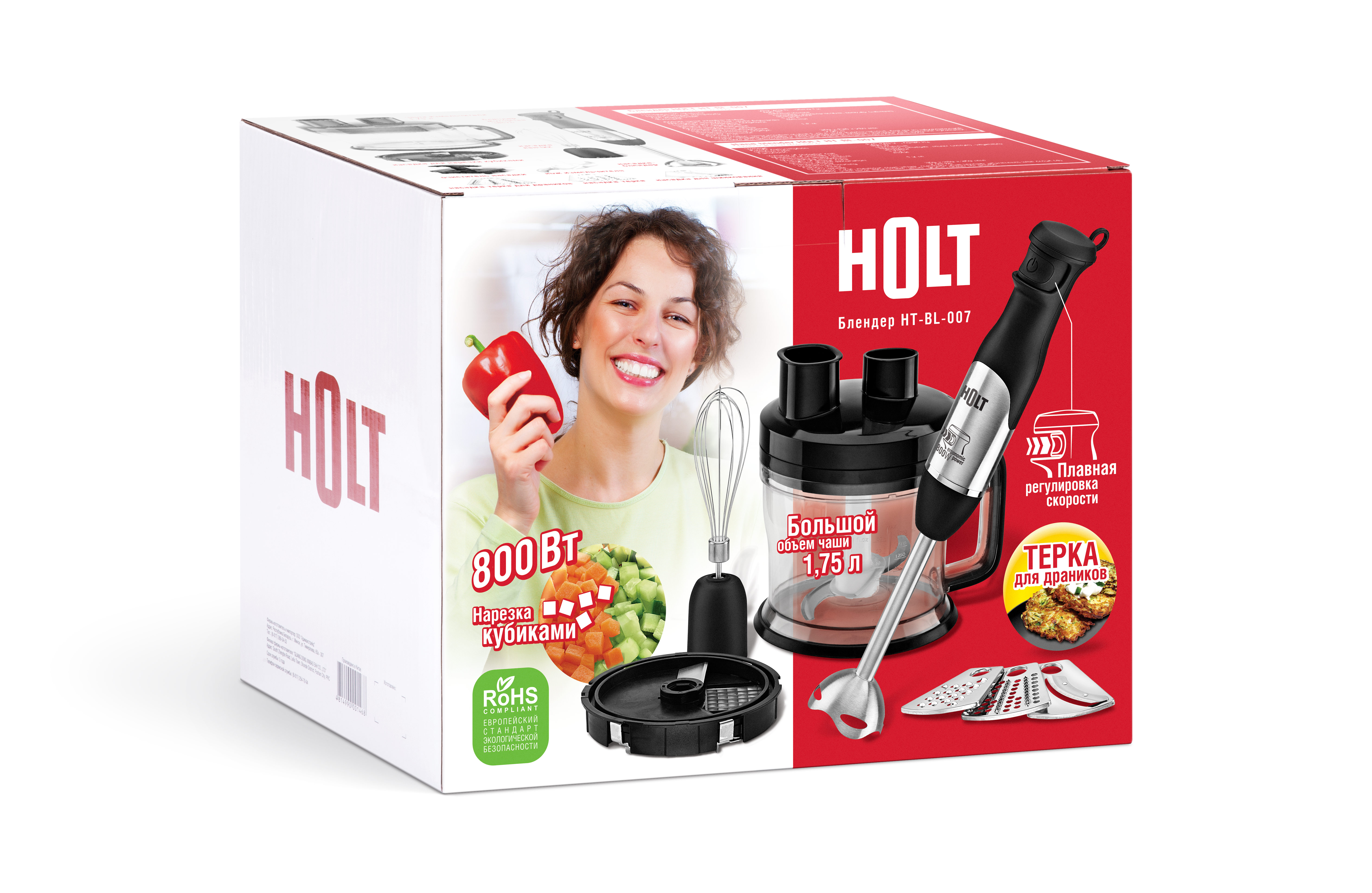 Насадки измельчитель (чаша измельчителя 1,75 л, нож), венчик из нержавеющей стали, насадка-блендер с крестообразным ножом из высококачественной нержавеющей стали, насадка для нарезки кубиками, насадка для шинкования, терка мелкая, терка для драников