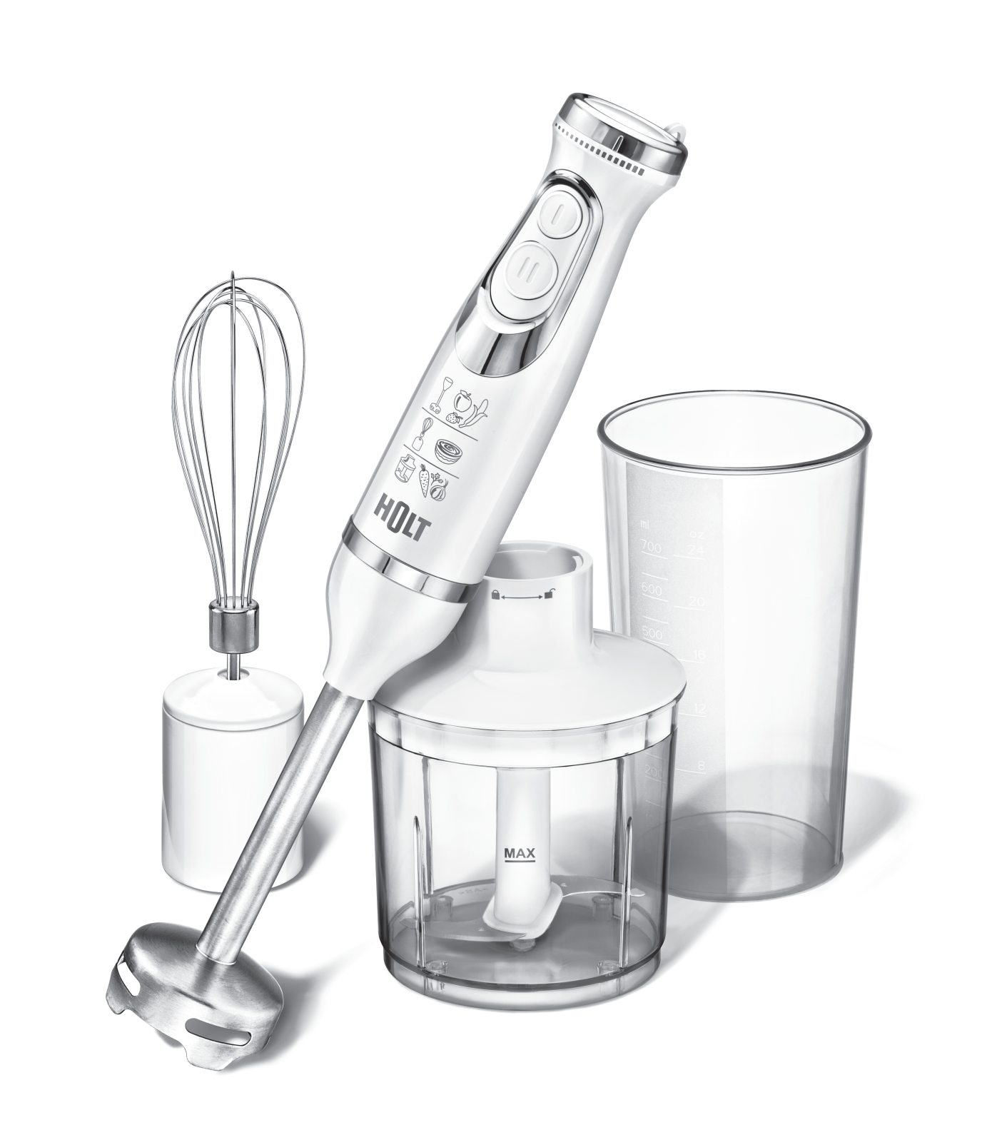 Насадки венчик из нержавеющей стали, чаша измельчителя 500 мл, нож измельчителя, насадка-блендер с ножом из высококачественной нержавеющей стали, мерный стакан 700 мл.