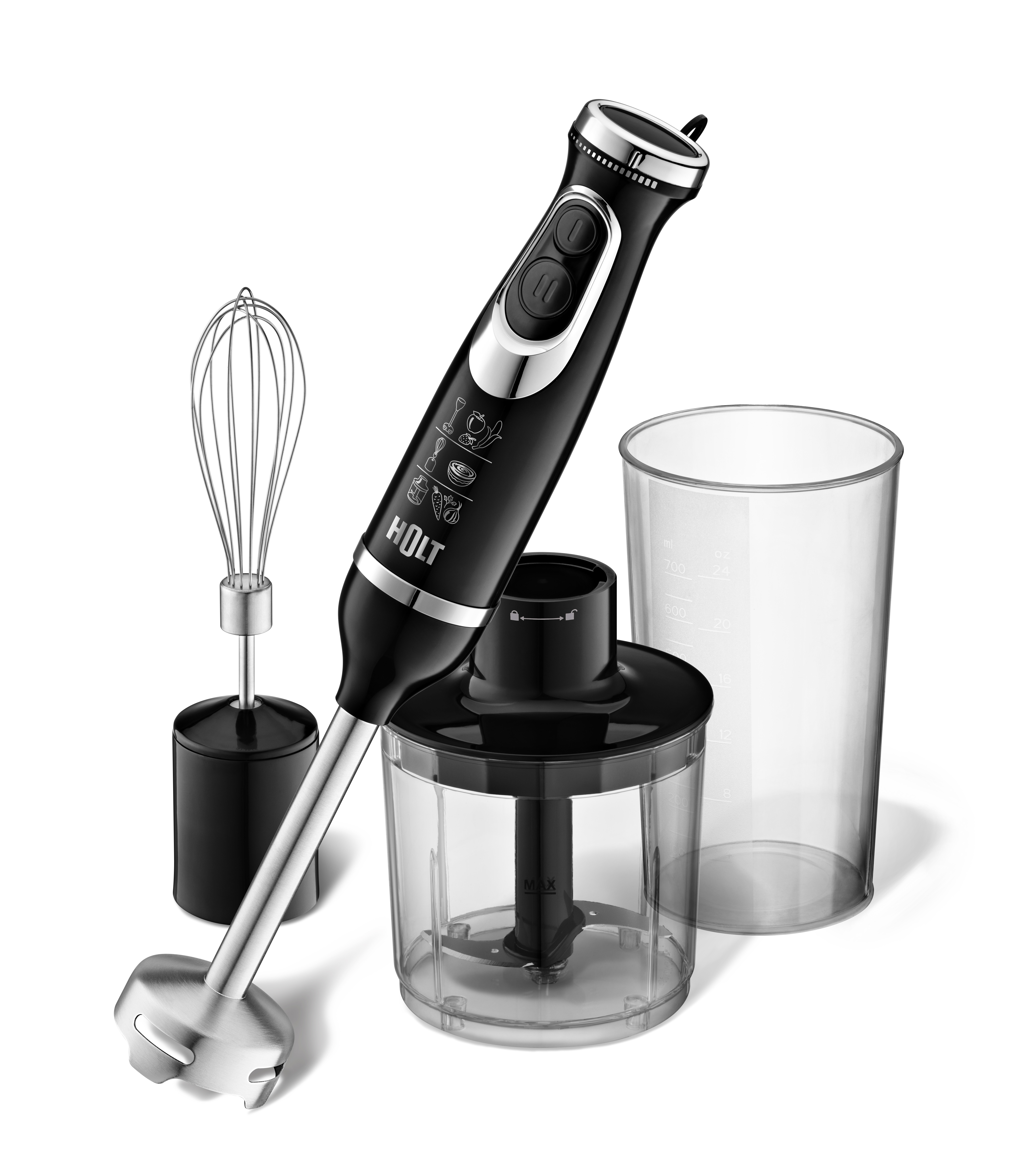 Насадки венчик из нержавеющей стали, чаша измельчителя 500 мл, мерный стакан 700 мл, нож измельчителя, насадка-блендер с ножом из высококачественной нержавеющей стали
