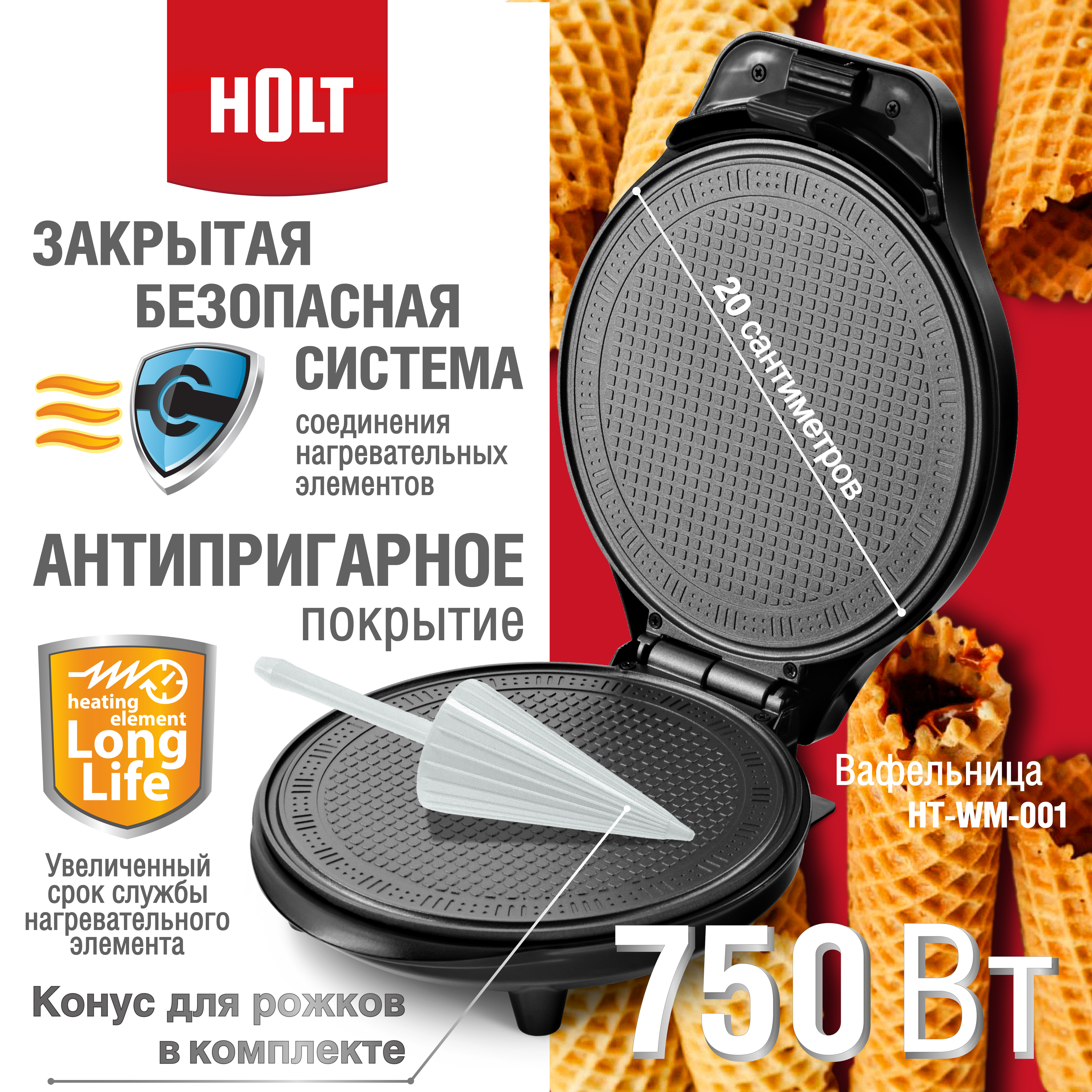 Электрическая вафельница HOLT HT-WM-001 предназначена для приготовления тонких вафель. Имеет закрытую безопасную систему соединения нагревательных элементов, независимые нагреватели в каждой половине формы. Оснащена световыми индикаторами включения и готовности к работе, так же автоматической регулировкой температуры. Покрытие пластин для запекания антипригарное. Комплектуется конусом для приготовления рожков.